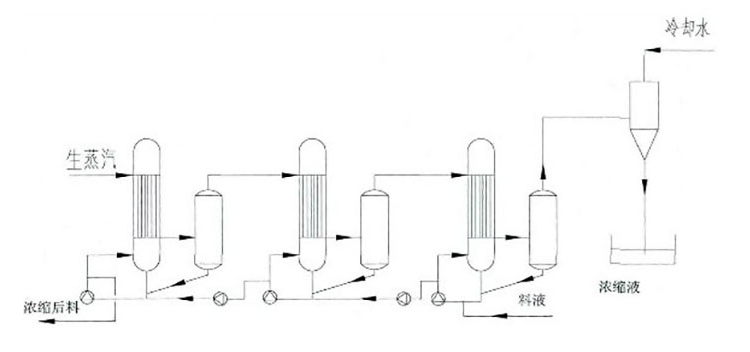 (2)逆流法:被蒸发的物料与蒸汽的流动方向相反,主要用于进料温度较低,但出口温度较高的工艺情况。进料无需预热或少许预热,节约了蒸汽用量,但整个过程需要用泵来输送物料,增加了用电量。