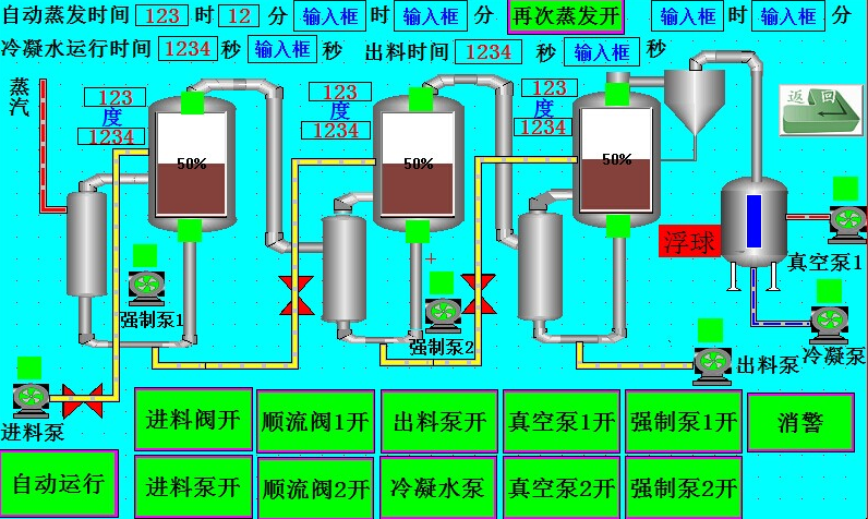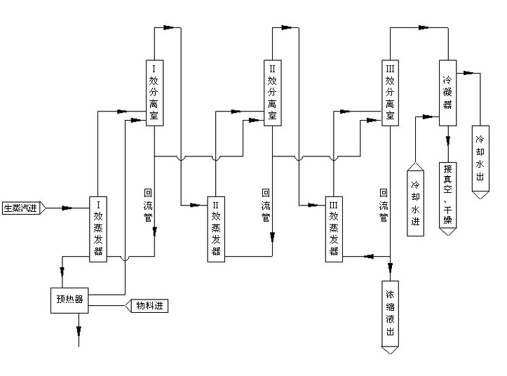 主要用的设备包括一效分离室,二效分离室,三效分离室,一效蒸发器,二效蒸发器,三效蒸发器,回流管,预热器,冷凝器等设备。